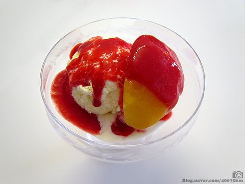 부드러운 바닐라 아이스크림과, 역시 부드럽지만 약간은 씹히는 맛을 느낄 수 있는 달콤한 복숭아 절임, 그리고 그 위를 뒤덮는 새콤한 라즈베리 퓨레의 맛이 잘 어울리는 디저트입니다.