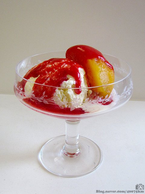 바닐라 아이스크림을 한 스쿱 듬뿍 떠서 접시에 담고, 그 위에 복숭아 반 쪽을 올린 다음 라즈베리 퓨레를 넉넉하게 뿌려주면