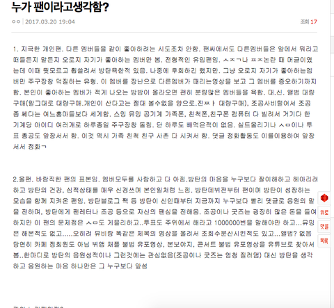 2.올팬. 바람직한 팬의 표본임. 멤버모두를 사랑하고 다 아낌.방탄의 마음을 누구보다 잘이해하고 헤아리려 하고 방탄의 건강, 심적상태를 매우 신경쓰며 본인일처럼 느낌. 방탄데뷔전부터 팬이며 방탄이 성장하는 모습을 함께 지켜온 팬임. 방탄블로그 짹 등 방탄이 신인때부터 지금까지 누구보다 빨리 댓글로 응원의 말을 전하며, 방탄에게 팬레터나 조공 등으로 자신의 팬심을 전해옴. 조공이나 굿즈는 굉장히 많은 돈을 들여 하지만 이 팬의 문제점은 ㅅㅁ도 게을리하고..투표도 주위에서 해라고 1000000번을 말해야만 하고...뮤밍은 해본적도 없고.....오히려 뮤비랑 똑같은 제목의 영상을 올려서 조회수분산시킨적도 있고...앨범? 없음 당연히 카페 정회원도 아님 뷔앱 채플 불법 유포영상, 본보야지, 콘서트 불법 유포영상을 유튜브로 찾아서 봄..한마디로 방탄의 음원성적이나 그런것에는 관심없음(조공이나 굿즈는 엄청 질러댐) 대신 방탄을 생각하고 응원하는 마음 하나만은 그 누구보다 앞섬