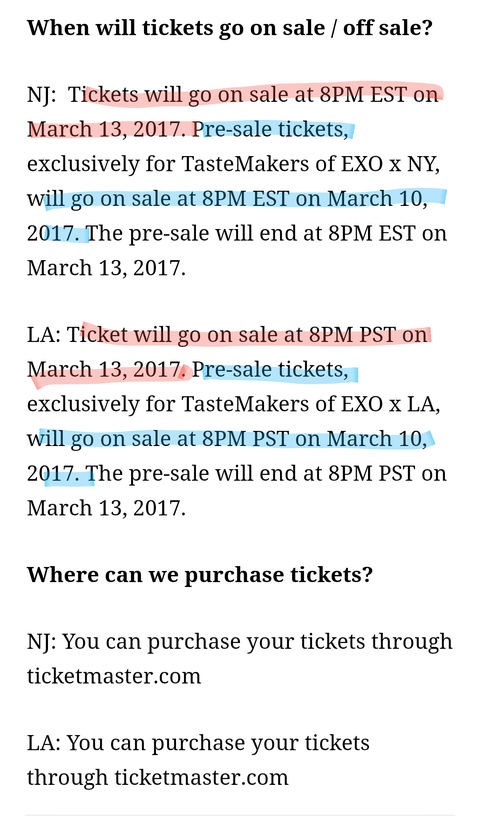 엑소팬들이 자꾸 말하는 pre-sale은 3월 10일부터 13일 까지고(파란줄부분) 이미 끝남.