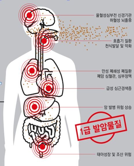 (WHO)가 '1급 발암물질'로 지정하였다. 우리가 황사를 얘기할 때 흔히 유해물질로 언급되는 '미세먼지'는 지름이 10마이크로미터(㎛, 1㎛=1000분의 1mm) 이하인 작은 먼지(Particulate Matter 10, PM10)를 가리키는데, 이것보다도 크기가 4분의 1에 불과한 초미세먼지(PM2.5, 지름 2.5㎛ 이하의 극히 작은 먼지)는 호흡기뿐만 아니라 피부로도 침투가 가능한 위험물질이다.