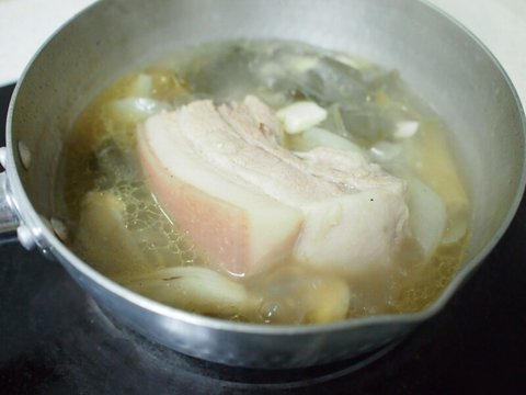 이제 다 끓으면 고기를 넣고 약 1시간 가량 뒤적이며 삶아줍니다.