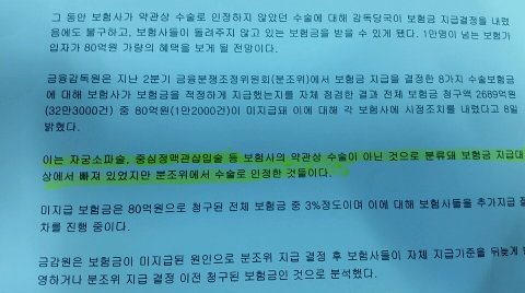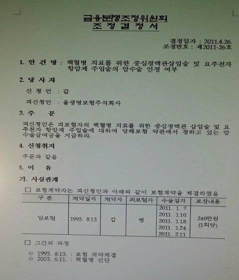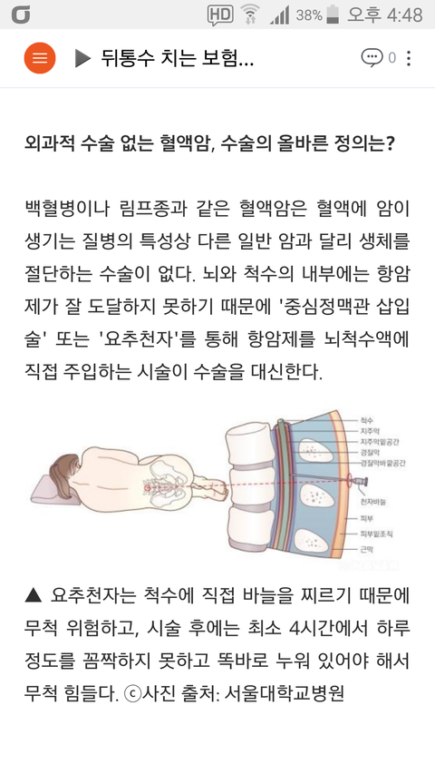 저는 현재 백혈병(급성림프구성 )으로 투병중인( 2016년11월진단)암환자 ㅇㅇㅇ입니다. 다름이 아니라 제가 10년 전에 삼성이라는 브랜드만 믿고 가입한 삼성화재(무배당뉴삼성슈퍼보험)에 중심정맥관삽입술(히크만카테터)수술비와 척수강내 항암제 주입술(요추천자항암제주입술 )수술비를 청구하니 자기들의 약관에 나와있는 암치료에 직접적인 치료 목적이 아니라 지급 할 수 가 없다고 합니다. 중심정맥관삽입수술은 금감원에서 수술로 인정하기로한 8가지 수술중에 중심정맥관삽입수술과 척수강내항암제주입술이 포함 되어 있는데도 말입니다. 그리고