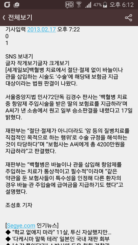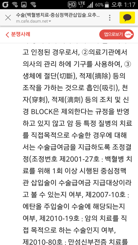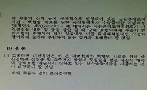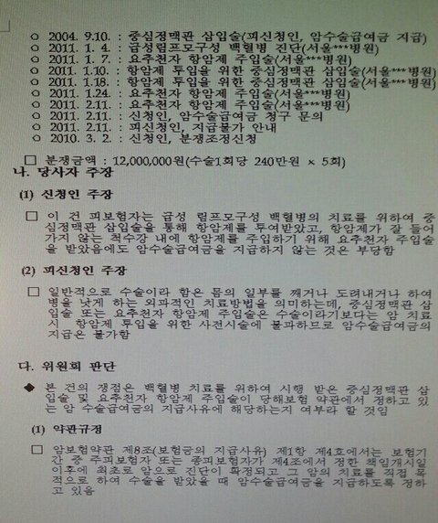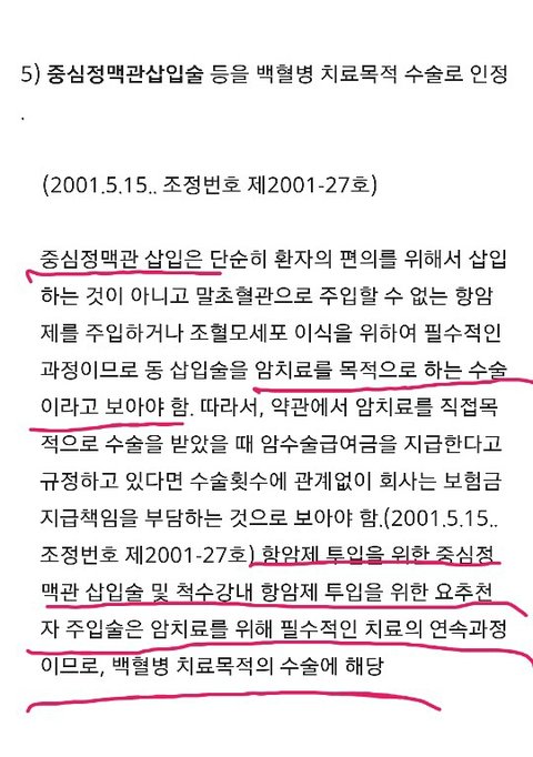 백혈병은 다른 고형암(대장암 위암 유방암 간암등)과 같이 치료를 위해 기구를 사용하여 생체에 절단,절제등의 조작을 가하는 것이 아니라 오로지 척수강내항암제주입술(요추천자항암제주입술 이라고도하고 항암제가 잘 들어가지 않는 척수강 내에 항암제를 주입)과 중심정맥관삽입수술(히크만카테터)이라는 몸통에서 심장으로 들어가는쇄골하정맥 경정맥 대퇴정맥등 크고 굵은 정맥에 관을 삽입하고 항암제를 투여하여 암 치료를 하는 방법 밖엔 없습니다.어떻게 이 수술들이 백혈병 치료에 직접적이고 필수적인 목적이 아니라고 할 수 있습니까 중심정맥관삽입술(히크만카테터)과 척수강내 항암제 주입술 (요추천자항암제주입술)아니면 어떠한 방법으로 백혈병 치료를 해야 한단 말입니까 삼성화재는 중심정맥관삽입술(히크만카테터)과 척수강내 항암제 주입술(요추천자항암제주입술 )이 백혈병 치료에 직접적인 치료 방법이 아니고 또 자기들에게 유리한 오래된 대법원 판례를 예를 들며 지금까지 수술비 지급을 거부 하고 있습니다. 아직 많은 수술과 항암치료와 입퇴원을 반복 해야하는 한 개인이 삼성화재라는 거대한 대기업과 맞서 싸운다는게 이렇게 힘들고 억울 할줄 몰랐습니다.