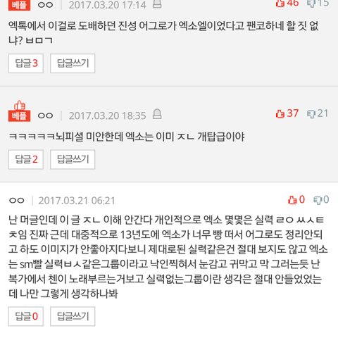 ㅋㅋㅋㅋㅋㅋㅋㅋㅋㅋㅋ엑소 실력이나 대상이나 해외인기 앨범 이런걸로 까대는데 일단 톡선에서 4년연속 대상을 별거아닌식으로 까내리고 시작하는거부터가 ㅈㄴ웃김 근데 어쩌냐 다른 아이돌들은 대상이 최대 목표인 아이돌도있고 막 받으면 눈물부터 쏟고 그러는데 너무 기뻐서ㅋㅋㅋㅋㅋ그걸 별거 아니란식으로 얘기하면 어쩌란거임 지들이 받아봐 얼마나 힘들게 노력해서 얻은결과인데 그걸 무참히 밟아버리네ㅜ 실력으로까는것도 조카 웃겨 13년도시절 으르렁 나왔을때는 뭔반응이었는지 아냐? 내가 그때 똑똑히 기억함 엑소는 춤 진짜 ㅈㄴ잘춘다고 실력파그룹이라고 칭찬하고 그러는거ㅋㅋㅋ 다른 사이트에서도 엑소 춤실력 보컬라인 노래실력은 ㅇㅈ한다고 하는거ㅜ ㄹㅇ조카답답하네 현재 다른아이돌들 치고올라오면서 엑소 머리채잡고 무조건 지오빠들이랑 엑소랑 붙여서 실력 비교하고 그러는데 니들이 한번 당해봐라 ㅅㅂㄴ들아 니오빠들이랑 자꾸 비교하고 그래서 애꿎은 엑소 이미지 ㅈㄴ 실력없는 에셈빨그룹으로 만들어버리지마 애들 노래실력 박찬열 작곡실력 이런거 한번이라도 듣기는 하나몰라 ㅆㅂ년들 제발 비교대상을 엑소로 삼지말아줘 부탁이야 조카힘들다 진짜 시1발 징글ㄹ징글한년들 하ㅋㅋ 사진은 댓글 머글글 공감돼서 올림