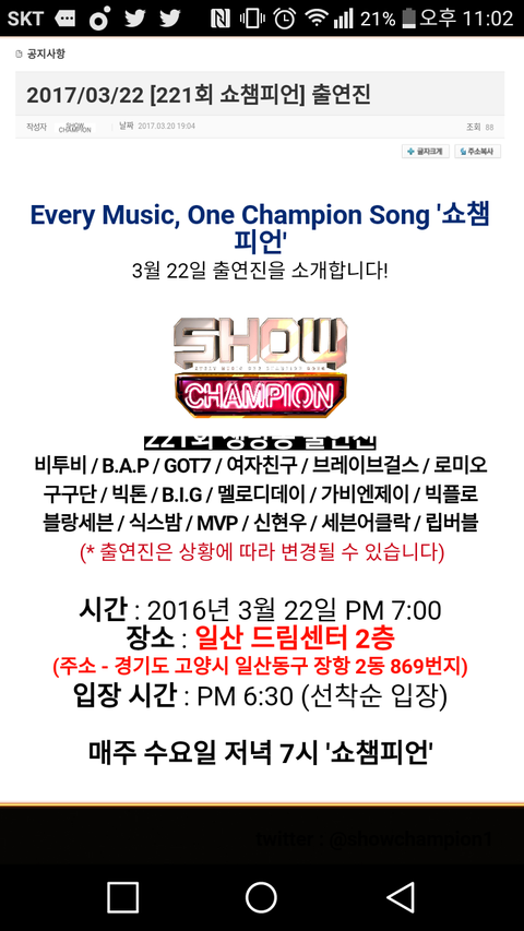 안녕 내가 3월 22일 쇼챔 방청 이벤트 당첨됐는데