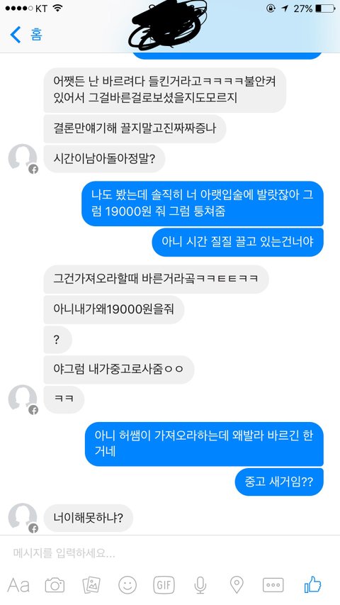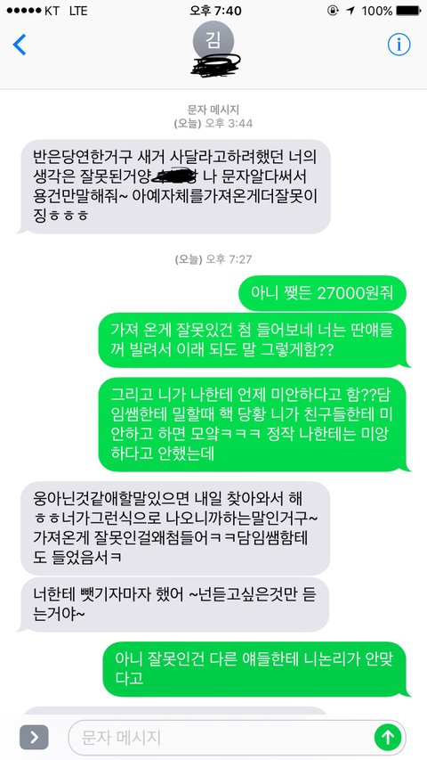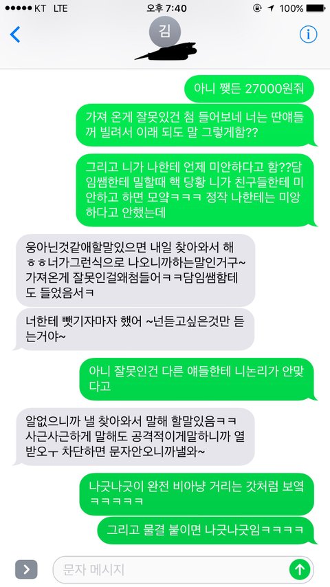 (긴글주의)사진은 밑에 부타 봐주세요!!제가 글이란걸 잘못쓰지만 어디다 털어놓고 객관적이게 물어볼 사람이 없어서 이렇게 글을 씁니다.제가 요번에 베네틴트를 학교에 가져갔습니다.그리고 친구가 빌려달라고해서 빌려줬고요.근데 걔가 바르다가 선생님한테 뺏겼대요.그래서 제가 당연히 물어내라고 했죠.처음에는 알겠다고 담임 선생님한테 말하면 받을수 있다는 듯이 말해서 알겠다고 그럼 안 물어줘도 된다고 했어요.근데 한 3일??지났나??갑자기 못받는다는 거예요.그래놓고 제가 주인이라서 내려가서 말하면 준다는 거예요.그래서 저는 당연히 가서 이야기 했죠.근데 선생님 말씀이 규정은 규정이기 때문에 줄수 없다고 말하셨고 저는 알겠다고 하고 그 얘한테 물어달라고 했습니다.근데 적반하장 식으로 자기는 선생님한테 뺏기기 전에는 안발랐고 얘기를 했고 선생님께서 달라고 했을 발랐다는 거예요 이게 더 이해가 안되는 거죠 그래서 처음에는 제가 새거를 사주던가 아니면 원값을 달라고 했어요 저는 원값으로 샀으니까요.근데 그렇게는 못하겠데요.대신 지금 인터파크에서 활인하는데 그거의 반값을 준다는 거죠 아예 다준다는 것도 아니고요.이때부터 응??김친가 했죠 그리고 제가 계속 재촉하니까 담임한테 제가 돈달라소 협박한다고 꼰질러서 저는 걔 담임한테가서 된통 혼나고 왔습니다.그 담임 선생님 말씀이 저는 학교에 틴트를 가져온게 잘못이고 빌려준게 잘못이라고 하셨고 또 걔는 바른게 잘못이라며 계속 돈달라고 재촉하면 그건 협박이니까 학폭위 감이라는 거예요...그렇게 저는 억울해서 눈물을 흘리려고 하니까 뭘잘했다고 우냐고 또 저만 혼났어요 솔직히 걔담임쌤이라고 일방적으로 걔편만 드니까 그게 제일 억울했습니다.그리고 걔는 걔 담임쌤께서 저만 혼내니까 그걸로 투집잡아서 가져온게 잘못이니까 계속 활인값의 반을 주겠데요 제잘못까지 쳐서요 그래서 제가 억울했지만 원값에 반을 달라고 했더니만 걔가 자기는 원값에 반을 못주겠다며 활인값에 반에 제가 3번써서3000을 더빼서 16000을 오늘 주고 더는 못주겠다며 제게 화를 내고 갔습니다 학교에서도 특별하게 조치를 취하지 않으니까 걔는 더 기세등등 하네요 무슨 특별한 방법 없을까요 정말 억울합니다..미흡하고 긴글 일어주셔서 감사합니다..