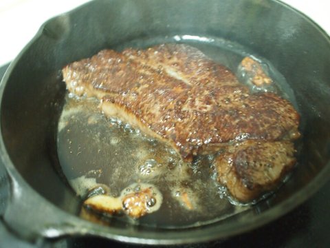김 날 정도로 뜨거운 무쇠팬에 올리브유 조금 두르고 고기 올려서