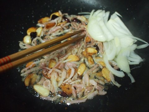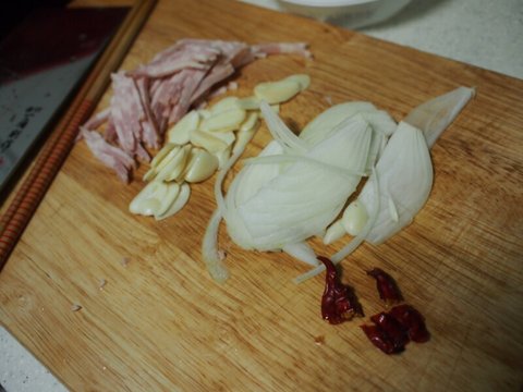 면 익는 동안 양파 4분의 1개, 마늘 5개, 베트남 고추 3개, 베이컨 3장 채썰고,