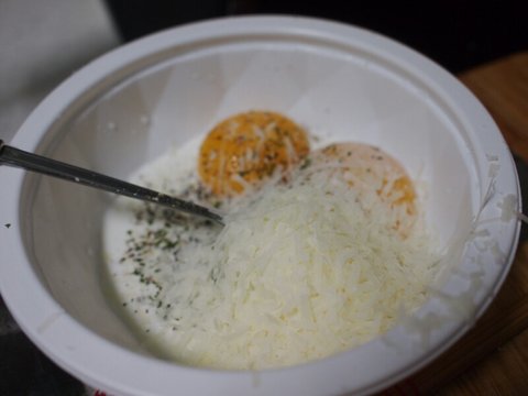 계란 노른자 2개에 생크림 3스푼, 파슬리가루, 소금, 후추, 파마산 치즈 갈아서 준비해줍니다.