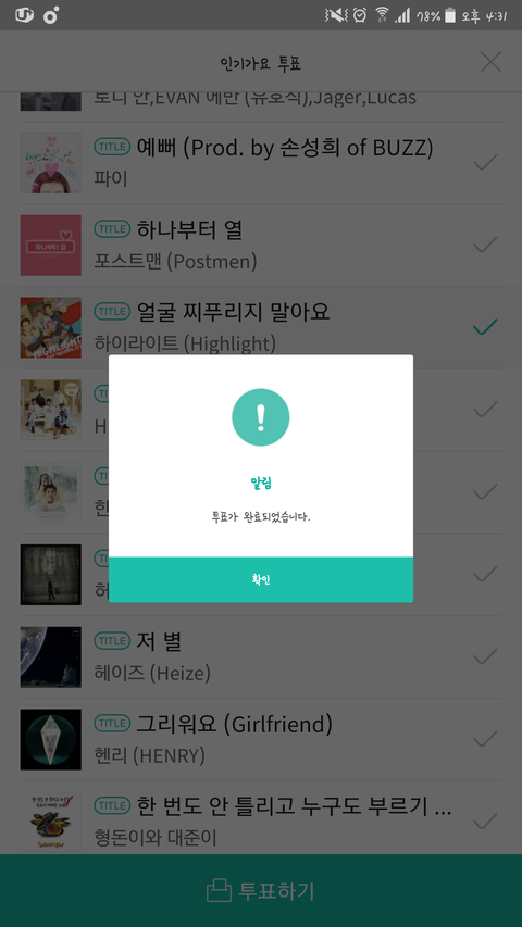 아지톡 어플 깔고 로그인해서 하이라이트 얼찌푸랑 남은 두 가수 눈치껏 투표(실시간투표 없어져서 사전투표 진짜 중요함)