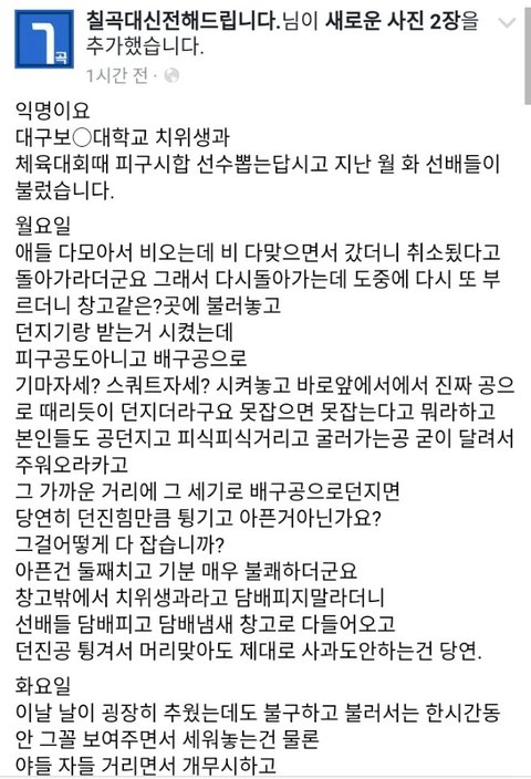 체육대회때 피구시합 선수뽑는답시고 지난 월 화 선배들이 불렀습니다.