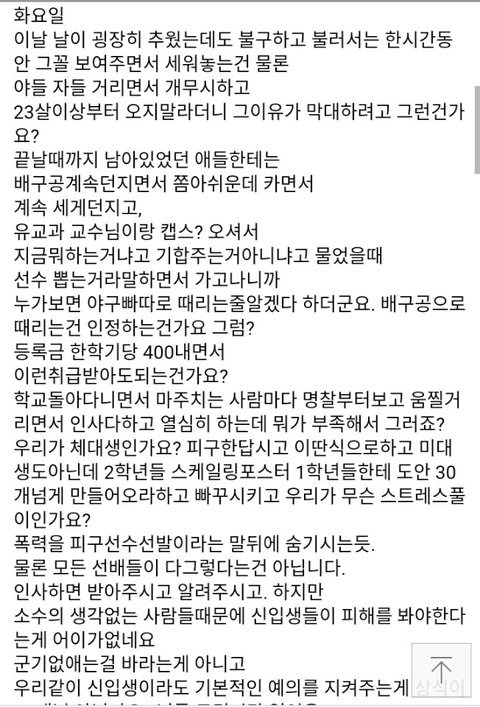 우리가 체대생인가요? 피구한답시고 이딴식으로하고 미대생도아닌데 2학년들 스케일링포스터 1학년들한테 도안 30개넘게 만들어오라하고 빠꾸시키고 우리가 무슨 스트레스풀이인가요?