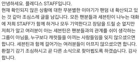 플디도 캐럿들이 안 믿을 거 뻔히 아니까 그냥 달래주는 겸 올린 것 같음. 글 길게 안 늘어뜨리고 해명이 아니라 그냥 우리한테 하고 싶은 말 한 것 같당