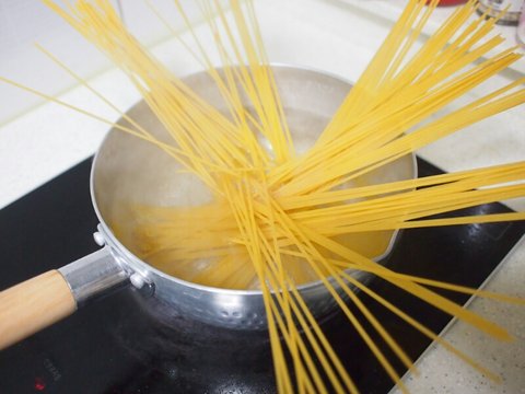 면은 면수 조금 남겨두고 물을 다 빼서 올리브유를 조금 둘러두고 둡니다.