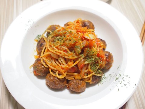 케챱하고, 면수 넣고, 소금, 후추 간하고, 미트볼까지 넣어서 같이 볶고 면을 투하해서.