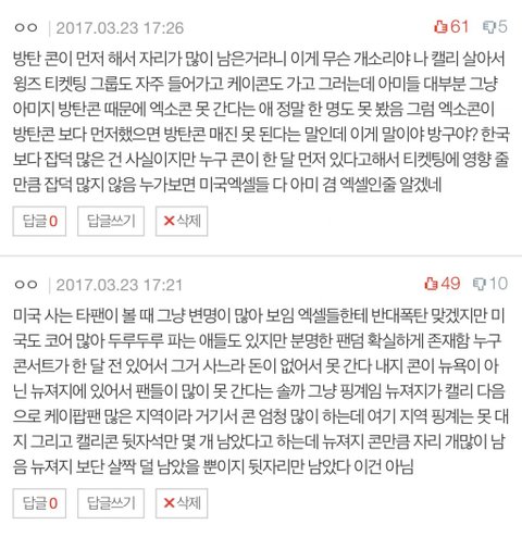 설명은 개똥 같겠지만 내가 한국어가 서툴러서 이렇게 올려봄. 그리고 엑소 콘 안팔린다고 하는년들 미국산다고 인증좀. 알지도 못하고 조카 판메 시작한지 30분후에 티켓 남은거 올리고 마치 아직도 그 자리가 남은거 처럼얘기하니까 존ㄴ ㅏ불쾌함 ^^ 내 친구는 스텐딩을 30분후에 했는데 못구해서 슬퍼했었음. 내가 엘레이에 있는 음반가게에서 일하는데, 엑소, 방탄, 다 인기 조카 있어 그러니까 제.발. 닥쳐줘