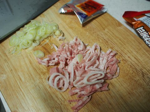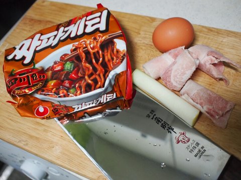 재료는 짜파게티 1봉, 파, 대패삼겹살 약간, 계란 1개.