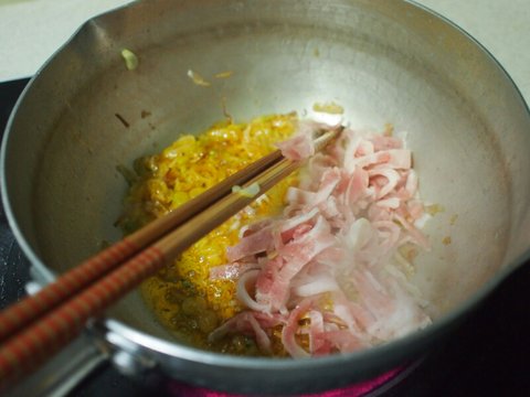 사천 유성스프 넣고 삼겹살도 같이 볶아줍니다. 이때 후추 조금.