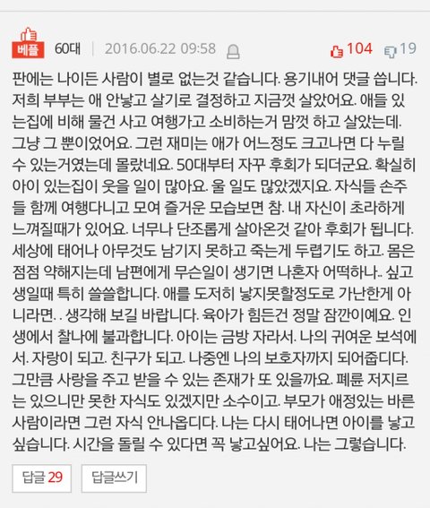 어느 60대 딩크족이 올린 댓글이었는데 너무 인상깊어 캡쳐했놨어요~ 젊은 부부의 댓글이 많으니 이런 댓글도 참고하시라고 올려봅니다..