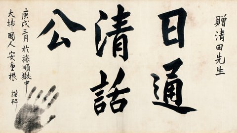 그 유묵 들 중에서도 <일통청화공(日通淸話公)>은 ‘날마다 맑고 좋은 이야기를 가지는 분.’이라는 뜻이며, 경술(1910)년 삼월 뤼순감옥(旅順獄中)에서 안중근 의사가 사형당하지 않도록 매일 기도하는 등 가깝게 지낸 것으로 알려져 있는 간수과장 기요타(淸田) 선생에게 증정한 유묵이다.