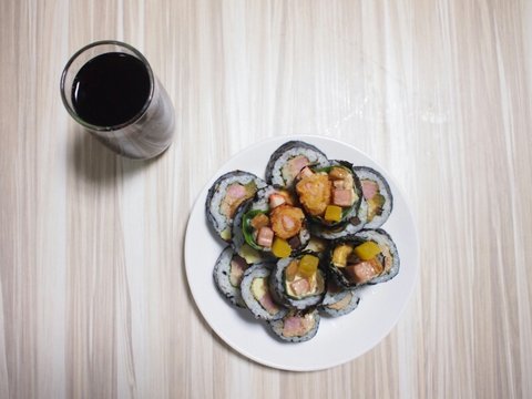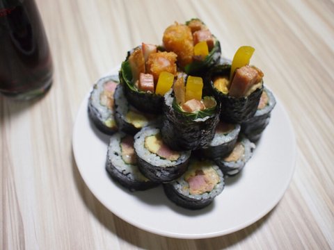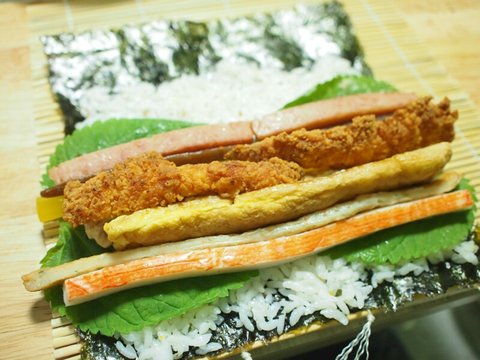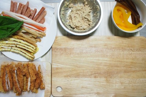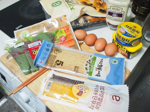 재료는 김, 단무지, 어묵, 깻잎, 참치, 게맛살, 우엉, 계란, 새우튀김?(할인하길래 집어옴), 스팸