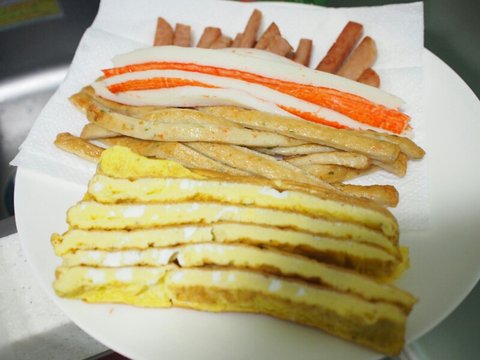 1차 재료 완성, 게맛살도 3등분해서 준비