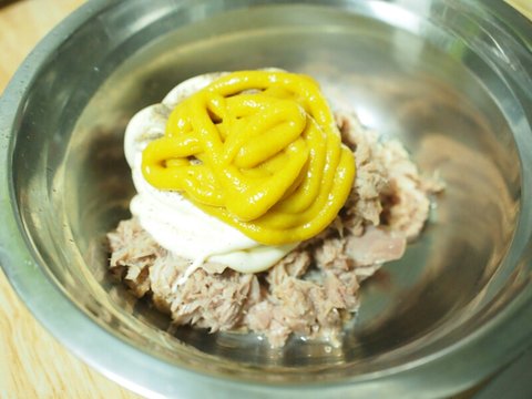 튀김이 들어가니까 참치마요네즈에 겨자를 조금 추가해줍니다. 소금 후추도 약간.