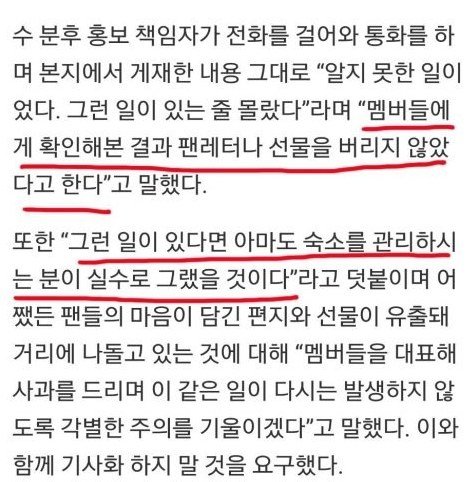 플레디스(소속사) 피드백: 청소부아주머니가 버렸다고했다. 라고알고있었으나