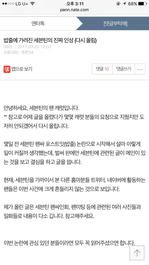 엔터톡 최신글이 "밥줄에 가려진 세븐틴 진짜 인성 (다시 올림)" 글 있어요. 검색하시면 나올 것 같아요.