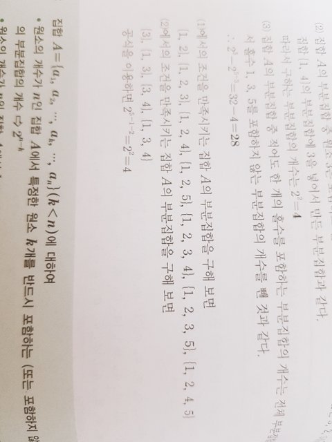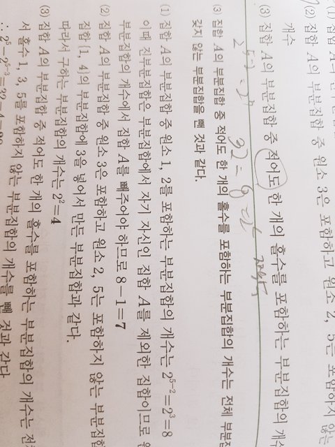 순열할때는 적어도는 반대 경우니까 홀수의 반대는 짝수 이렇게 하잖아 근데 여기서는 왜 반대 경우가 짝수가 아니라 홀수가 이닌 부분집합의 개수일까 ㅅㅂ 나는 짝수라고 생각해서 부분집합의 개수공식사용해서 2의 5제곱에서 3제곱뺐거든...