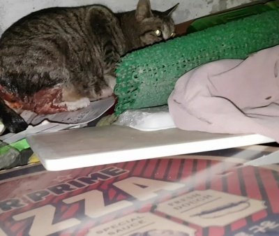 고양이는 뒷 다리를 끌며 나왔습니다.