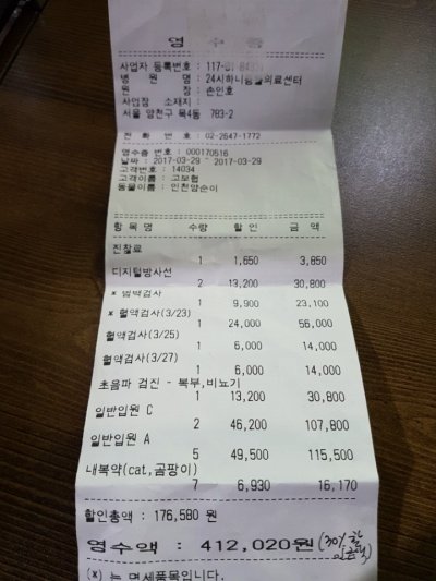 고보협에서 지원 받은 길냥이기에 176.580원 할인 받아 치료비는 총 412.020원 나왔습니다.