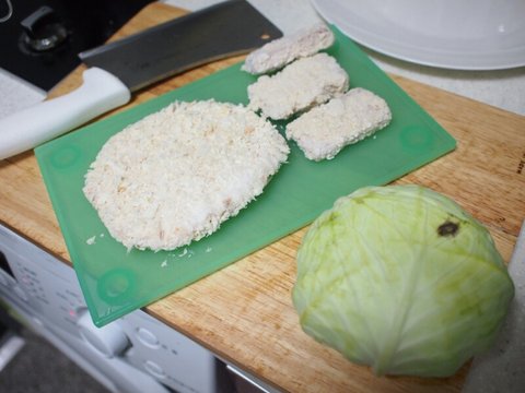 작은건 시판 생선까스, 양배추가 여드름이 생겼네. ㅠ