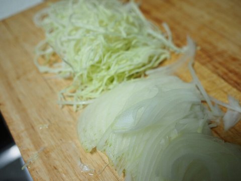 그 부분만 잘라내고, 양파와 양배추는 채썰어서 물에 담궈둬요.