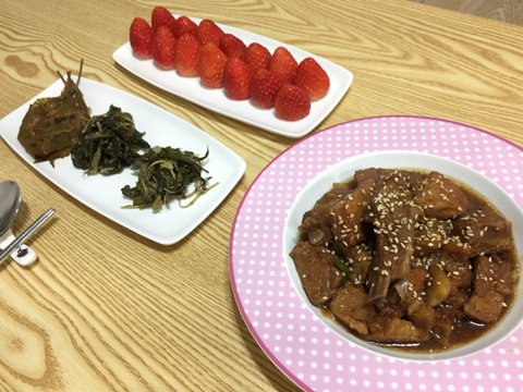 출근 전에 물에 담가놓고 핏물만 빼고서는, 퇴근해서 그제야 양념해서 만들었어요!
