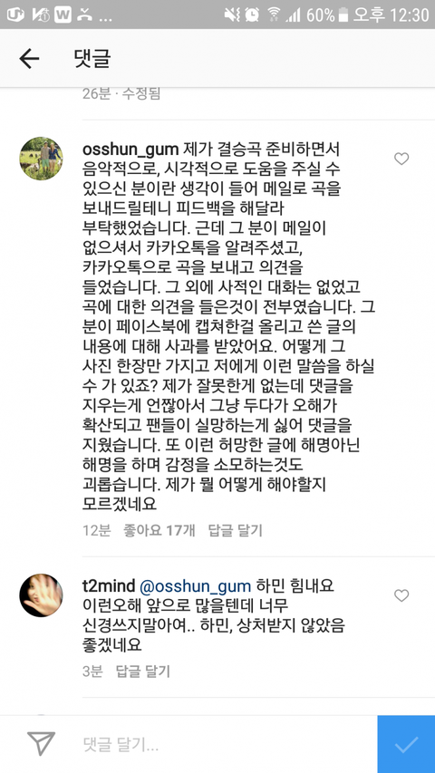어제 글뜨자마자 최하민이 피드백했고 오해아닌 오해 풀었고