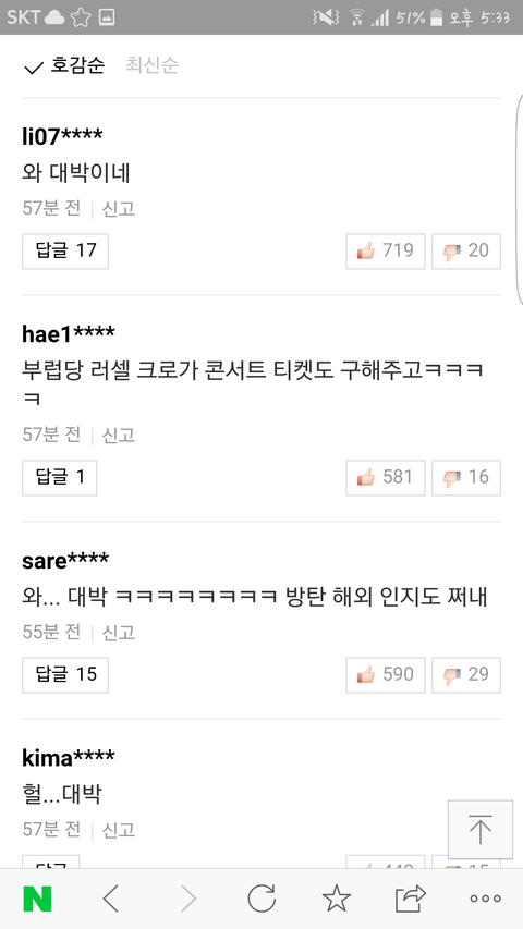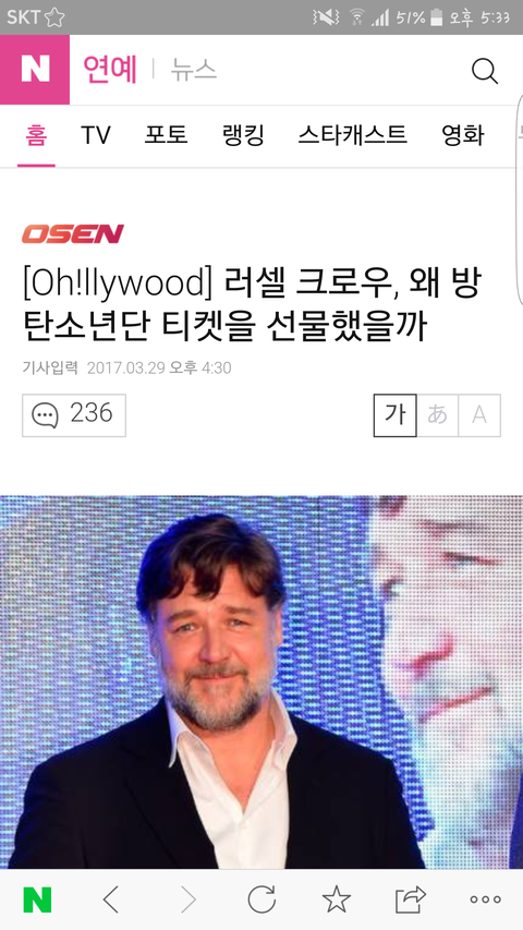 난 걍 가수상관없이 좋은노래 찾아듣는 머글인데 오늘자 방탄 뉴스기사 이거 개쩌는거아님??지난번 찰리푸스기사도 봤는데 이번엔 러셀크로우가 생일선물로 방탄티켓 선물 ㄷㄷㄷㄷㄷㄷ 아니 그럼 직접 티켓팅 한거?!?! 난 우물안 개구리라 방탄 해외인기 어느정도인진 모르겠지만 이정도면 해외에서 인정받은거 ㄹㅇ인듯 댓글반응도 다 대단하단 소리네