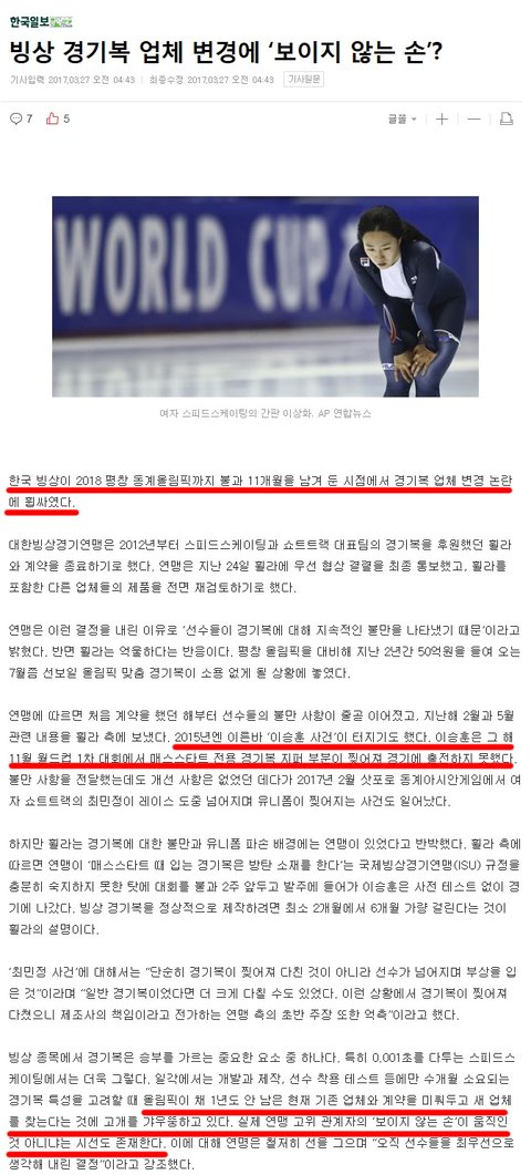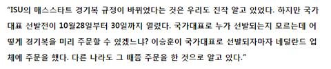 빙상연맹 또 지들탓 남탓으로 돌리기하네요ㅋㅋㅋ 올림픽 10달 남았는데 유니폼 교체한다는 이유가 스피드스케이트 이승훈 선수 얘기하네요ㅋㅋㅋㅋ 말도안되는 해명이 제일 웃김.