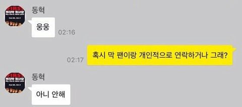 카톡은 주작이다 뭐다 말 많은데 음성은 누가봐도 빼박임. 이동혁 목소리가 흔한것도 아니고 어느 팬이 내새끼 목소리도 못알아듣겠음;( 지금은 음성 올린분이 기사보시고 신변보호 부탁하면서 계폭하신 상태)