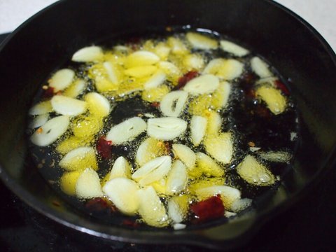 무쇠팬(무쇠솥이 있으면 좋겠지만)에 올리브오일 넣고 온도가 오르면 마늘과 고추 넣고 향이 올라올때까지 끓이다가