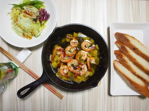 오일 듬뿍 찍은 바게트 위에 새우랑 마늘 올리고 한입 먹어봅니다.