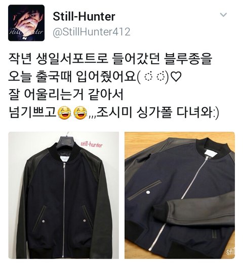 후니 오늘 싱가폴 입고간 블루종 작년 생일서폿이었대!!!