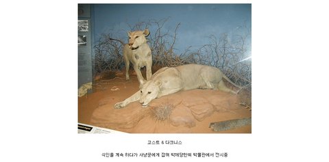 일명 사보의 숫사자 실제 2마리 숫사자였다고 한다... 보통 명포수 짐 코벳에 의해 사살당한것으로 알려져 있지만 사실 영국의 한 경비군인에 의해 사살되었다고...