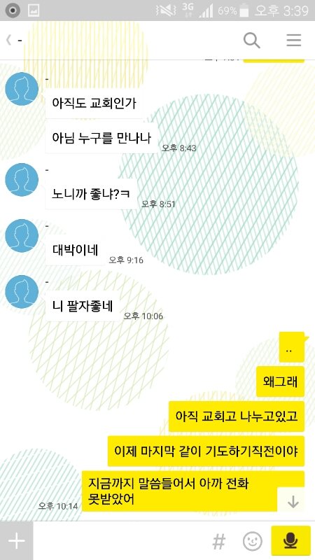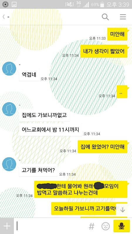 지금 오빠가 몸살로 좀 아파서 예민해서 그런지 그 이후로 오빠는 격한 감정표현 (위에 1번)은 그냥 했고, 제가 교회모임 왔다고 톡해놓고 연락이 안됐을때 막말까지 다시 했어요.