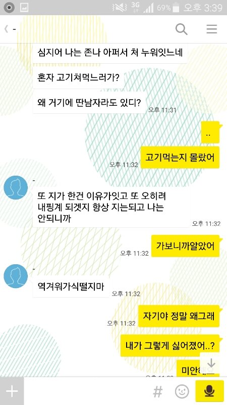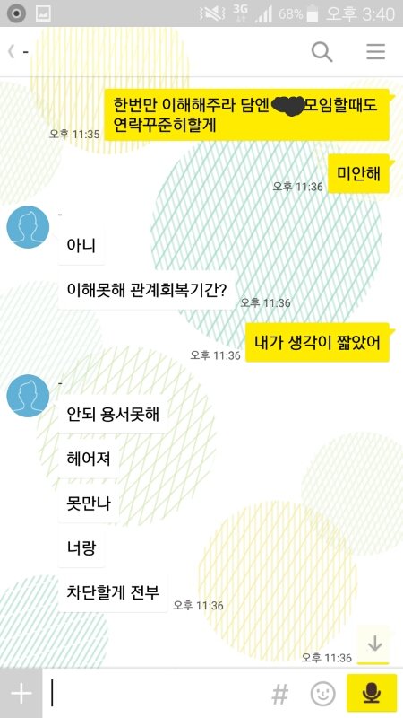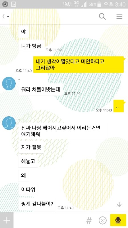 싸울때마다 이정도는 절대 아니고 이건 아주 심할때 입니다. 그리고 저도 같이 끝까지 싸울때가 더 많은데 이땐 오빠가 아프기도 했고 저희 사이도 위태로운 상태였고 제가 잘못하기도 했었기에 사태가 더 심각해지기 전에 막으려고 일단 미안하다고 얘기했던것 같아요.