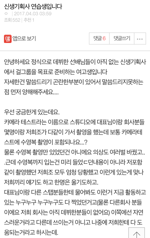 여판에 있는글인데 이런거보면 연습생진짜 극한직업인것같음;;아니ㅁㅊ 진짜 왜 여자아이돌=성상품화 이렇게 연결되는지모르겠음 남돌은안그런것같은데... 진짜 힘들겠다;;뉴스검색해봐도 연습생들 성추행 성폭행 이런일들 진짜 많던데 제발 이런일들은 이제 없었으면좋겠음
