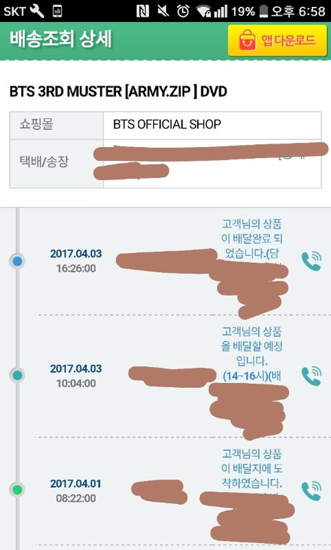 이렇게 나오면 배송 완료된거야?ㅠㅠ 간편배송이나 상품주문정보엔 배송중이라 뜨거든ㅠㅠ 주소를 잘못쓴건 아닌데 배송중에 분실된거라면 찾는방법 있어?ㅠㅠ 답변 꼭 해줘ㅠㅠㅠ
