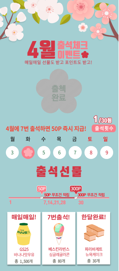 7번 출석 하면 50P는 기본이고