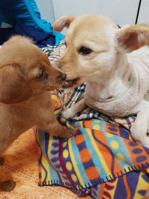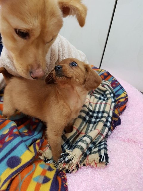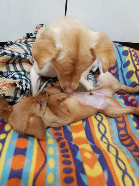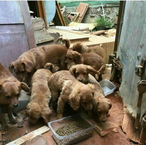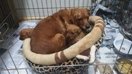 사연: 대학교 앞에 음식물쓰레기 주워 먹으며 살다가 새끼을 낳아 7마리는 죽고 새끼견 두마리 구조함.